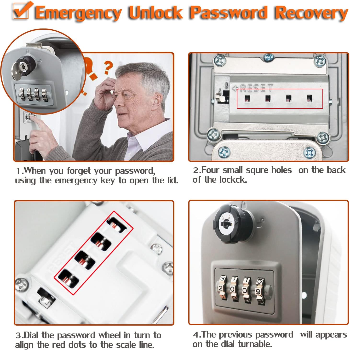 · Rendkívül magas biztonság - 4 számjegyű kombináció a kulcs nélküli kényelem érdekében, és visszaállíthatja a kombinációt a személyre szabott kombinált kód opciókhoz. Természetes: Ne felejtse el a jelszavát, vagy nem tudja megnyitni a kulcs tároló zárolódobozát.