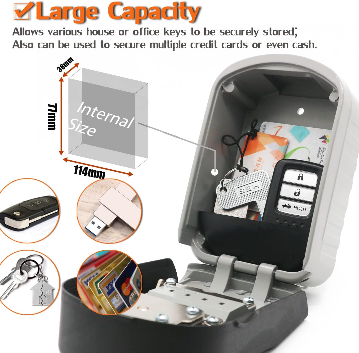 Key Safe Box Code Lock - Nagy tárolóhelyekkel (belső méret: 114*77,4*38 mm) Ez a kulcs zár doboz több kulcsot vagy hozzáférési kártyát tárol az ajtó mellett
