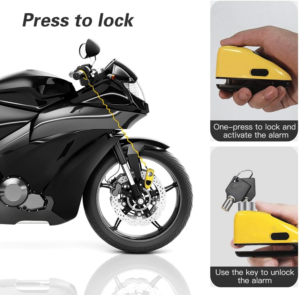 · Könnyen használható: A motorkerékpár-lopásgátló zárak könnyen rögzíthetők a riasztás gomb egyszerű megnyomásával. A zár azonnal bebizonyítja a riasztási módot, és sípolást fog hallani. Könnyű reteszelési folyamat.